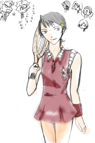 ほんのお遊びですよ。 【版権侵入バトン】 このバトンが回ってきた人は、自分のオリジナルキャラを好きな版権作品に侵入させて絵を描いてください。 描き終わったら感想や妄想を述べた後5人に回しましょう。 某六角中学庭球部に入部してみました。ユニは捏造です。この学校、古豪というのが合い言葉なのか、やたら旧字や漢字が多いんです。だってテニス部じゃないんだもん。庭球部なんだもん!「全国大会」じゃないんだもん。「全国大會」なんだもん!「売店」じゃないんだもん。「賣店」なんだもん!新聞じゃないんだもん。瓦版なんだもん! う、うちの大学みたいだ・・・!(笑 部活に至っては、弓道部、馬術部、刀部、浮世絵部、蹴鞠部! なんですか、これは。ネタですか?それとも千葉を馬鹿にしてるんですか?(際どい線ですね) と、ともあれ、そういうことで、ユニは今はやりのセパレートではなく、「エー○をねらえ!」の時代に流行ったワンピースタイプです。 なんつうか、まぁ、ぶっちゃけ、 やりたい方はどうぞ奮ってバトンお持ち下さい。 PR ◎Comment Comment Write |