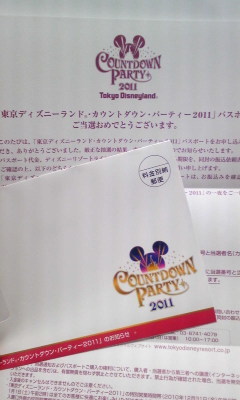 24日25日は抽選を外し、26日は特別営業で閉め出し。 そしてその日の夜のこと。 帰宅したらこんな物が届いていました。 し、しんじられない…!!! 在学中は仕事で行けなかったので申し込まず、去年は仕事修羅場でそれどころではなく、今年は…と思って一通だけエントリーしたのでした。 …ショーの抽選当たらないと思ったらこんな物が当たるとは… とりあえず、相手が見つかりそうです。 結構意外なところから。 最初相手いなくてどうしようかと思ったんですよね。社会人になったら一緒に行こう!と約束していた元友人はもうあてにならないので☆約束って破られるためにあるんですね。理解した。でも捨てる友あれば拾う友有りなんですね。有り難いことです。 無茶苦茶寒い戦場ですが、年越しの園内で暴れてきます。 お城と初日の出を拝むぞー! とりあえずめもめも。 持ち物は防寒具とおしりに引くマット。寒い。アラスカ行くくらいのノリで行った方がよい。アラスカ行ったことないけど。 後はカメラ。着物のミキミニを撮る。 友人曰くマスクがあるといいらしい。 年越しそばとお汁粉とお雑煮食べたい!(また食うのか! 欲を言うと、マッシュマニアの福袋がほしい。 ピアリに寄れたら嬉しいなぁ。